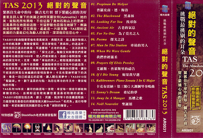 TAS系列18年来,严苛的筛选每一首歌,希望每一个音符都能够牵动您的心,并期盼这些歌能让您重温最初聆听的感动。TAS2013收录包括古典、爵士、民谣、摇滚等十四首严选歌曲,力邀发烧友最信任的德国发烧大厂Stockfisch「老虎鱼」进行母带后制,希望能让您找到属於您心中最「绝对的声音」。
